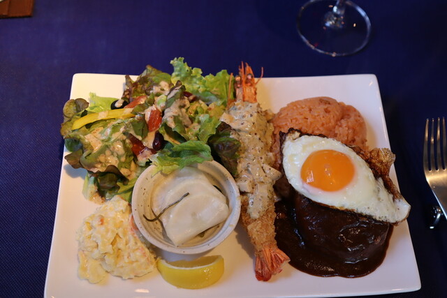 煮込みハンバーグ、有頭大海老フライ、ケチャップライス(2022年3月)