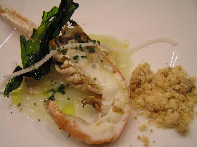 薪で焼いたスカンピと、その下には天然の白身魚(淡路産天然鯛)。
