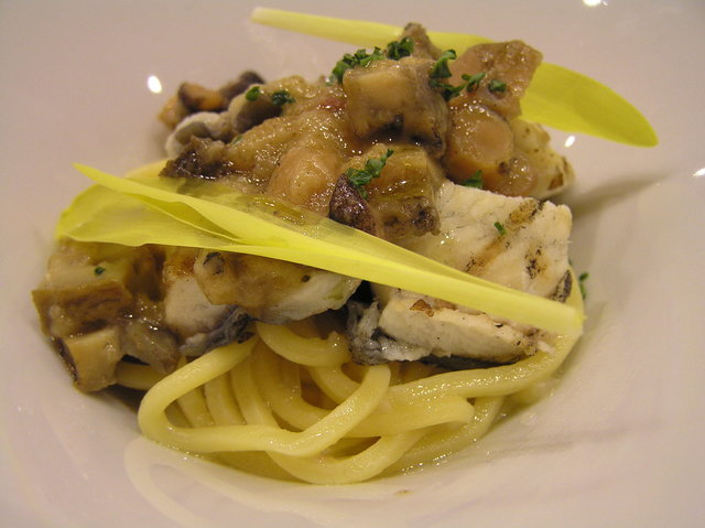 鰻を一度網焼きにし、その後ブイヨンで蒸し煮にし盛り付けて、そこに鮑とつぶ貝の煮込みを細かく切りソースにし、