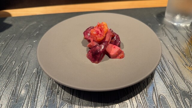 前菜のビーツとゆで玉子はポーションは控えめながら、目でも楽しめる色合いが綺麗。