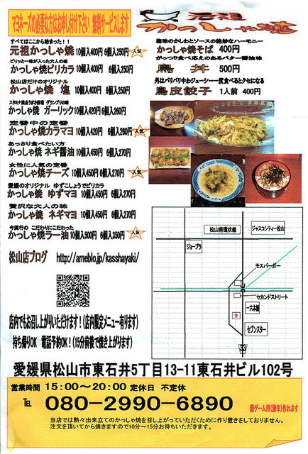 まあ何とも分かりづらい場所にお店を構えて居られる「元祖かっしゃ焼松山店」さんへ初見参。分かりづらい故に見つけた時の嬉しさはハンパなかったですわ。えも知れん雰囲気でいい感じに期待感を煽ってくれますな。