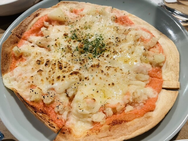 サラダ、アヒージョ、ポテト、ピザとワインがすすむメニューが続きます