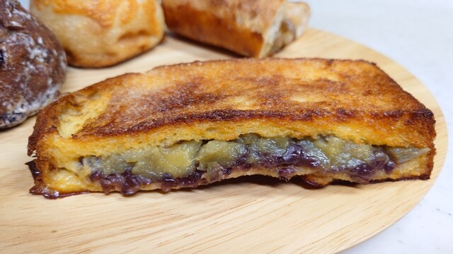 トーストは表面がパリッと焼かれていてアパレイユが染み込んで柔らかく、中のさつまいもの甘さとねっとりとした食感が美味しいです。つぶあんは控えめでむしろさつまいもと一体化しています。さつまいもとフレンチトーストって合いますね!家でも作ってみたい。