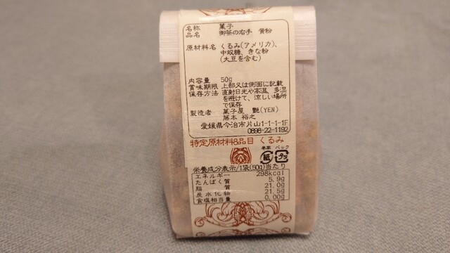 ごろっと大きな胡桃にきな粉がまぶされたお菓子。少しサクッとした食感があり、中双糖(ザラメ)の優しい甘さがあります。きな粉の風味は殆ど感じないかな…?原材料もかなりシンプルで、味も身体に優しいお菓子というイメージ。