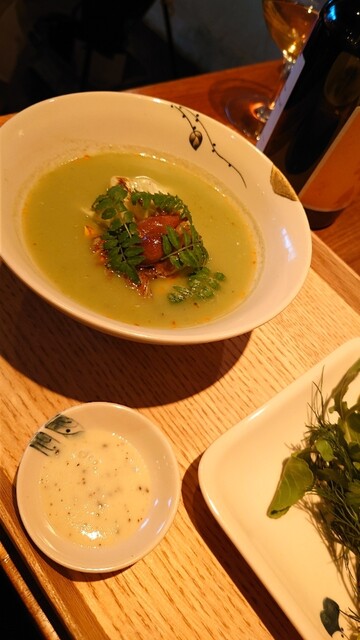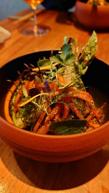 ベトナム料理をベースとし、日本の四季を映す野菜や果物・ハーブ・和食材で彩る皿を供しています。その魅力をさらに増すのが、ボーダレスなお酒の楽しみ。優しい皿に合うナチュラルワインを中心に、日本酒や焼酎も登場するペアリングは、新たな食の景色を見るような驚き!季節のコース&ドリンクペアリングで、その幸福感にひたれます。