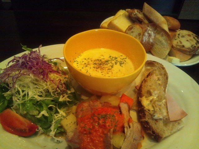 サラダ・メイン・スープ・添え物(?)・パン盛り合わせ(おかわりOK)、ドリンク付きのランチとなっています。