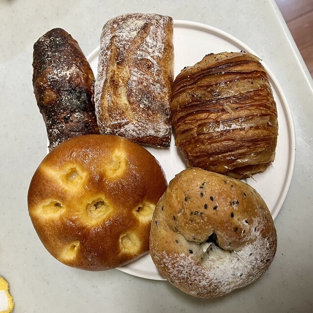 今度は早すぎたせいか、まだ揃ってませんでしたが、目当てのクロワッサンを購入することができました!その他にもクイニーアマン、スイートクロワッサン、メロンパン、ソーセージデニッシュ、デニッシュ食パンを購入。出来立ての油淋鶏サンドは甘香ばしく、とても美味しかったです!そしてデニッシュ食パン、甘めので、外側パリパリ、中はしっとり、これ、ほんと美味いです!オススメです♪