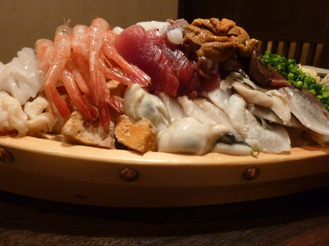 舟盛りの中には、マグロ、甘エビ、活タコ、サーモン、ホタテ、カニ、ウニ、