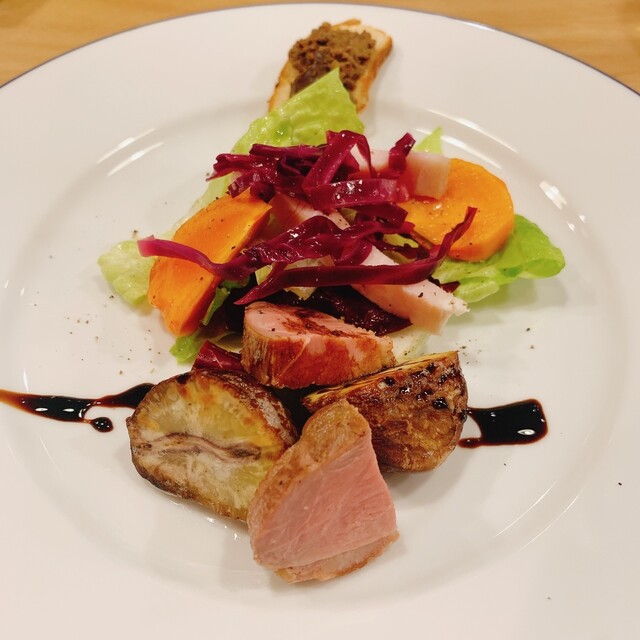 ガルシアポークロースハム、小鴨ロースと栗、鶏肝のクロスティーニ