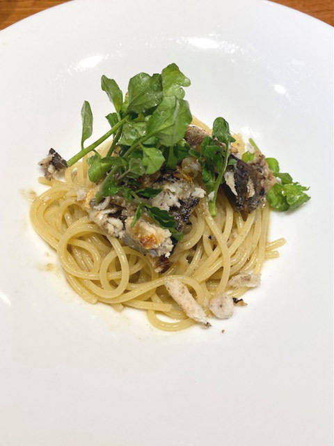 焼き上がった鮎をほぐしてパスタに投入、フライパンを煽ってオリーブオイルで仕上げ。