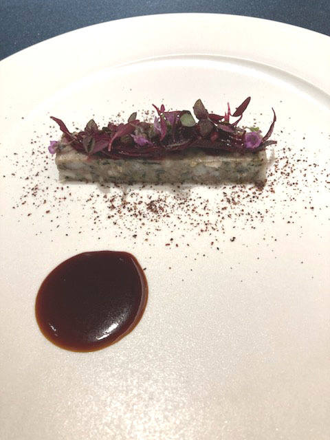 仔鴨、セップ茸のピュレ、パテの葡萄の葉包、ポレンタ、玉蜀黍
