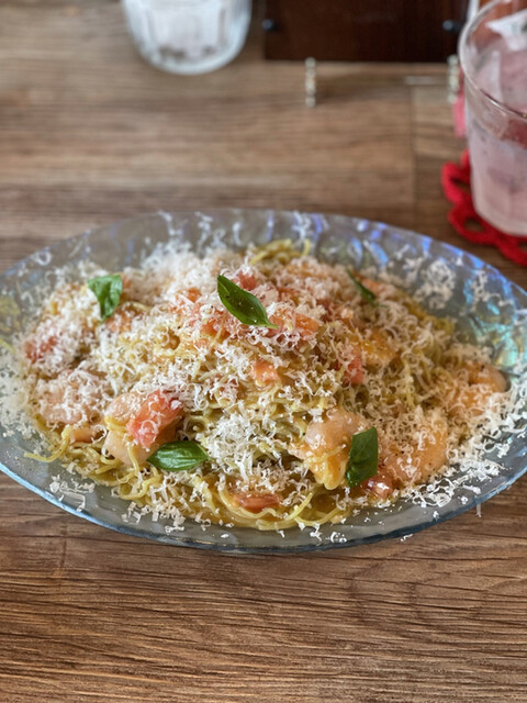 気まぐれパスタ「海老とトマトの冷製カッペリーニ」夏の風物詩的名物メニュー☆見て・食べて、夏を感じる♪爽やかなトマト観の奥行きがごいす~☆気まぐれパスタに・レギュラーメニューに☆相変わらず通っています。