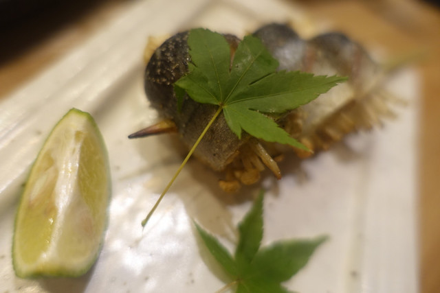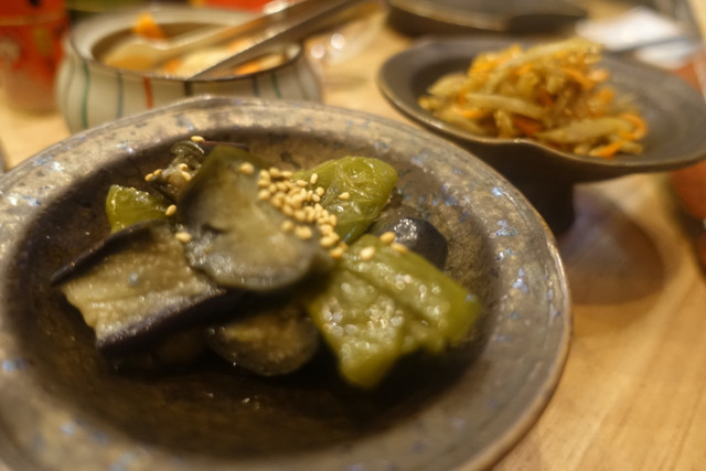 カウンターですと一品サービスしていただけるということで、なすの煮浸しときんぴらゴボウをチョイス。