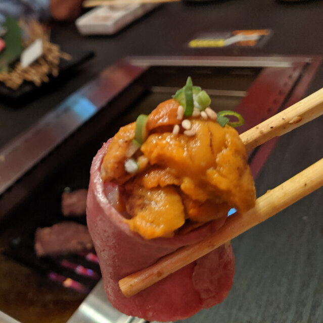 うにと生肉、どちらもねっとり濃厚で一見相容れないように思えるけどあら不思議、より濃厚な味わいに。