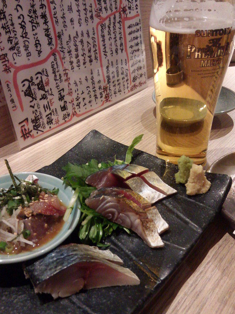 生サバ刺身・なめろう・ごまサバ、もつ煮込みとビールを注文。