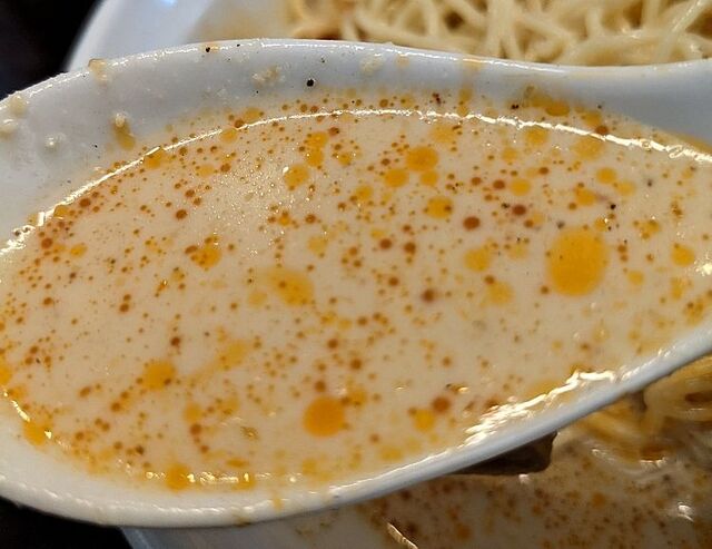 つけ汁は、豚骨白湯スープベースだと思う。そこにイワシ煮干しや節系の強い魚介風味があり、ねっとりした中に少しざらつきのある感じ。実際、麺をつけると粉のようなものが付着する。醤油だれも力強い。