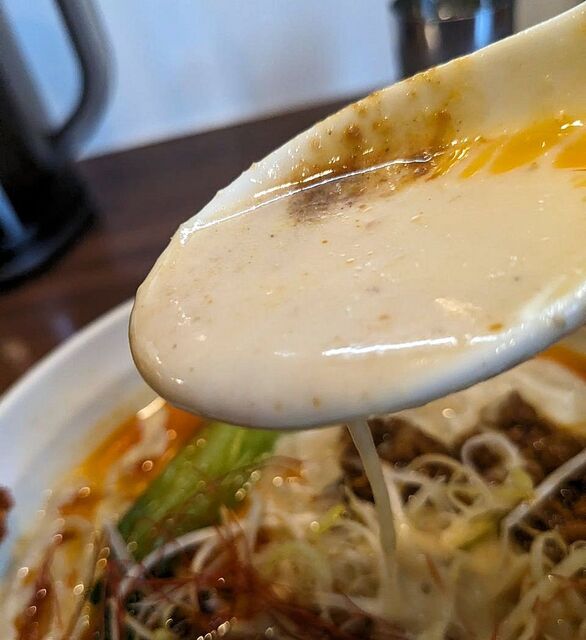 目の前に置かれただけで、花椒の香りがする。麺は16番太麺、加水率やや高し。つけ麺の麺と同じ感じ。スープはどろどろのタイプ。乳化豚骨にゴマペーストを加えたか。中国山椒、花椒のしびれる辛さが適度にきいているが、カプサイシン系の唐辛子タイプの辛味が少ないから食べやすい。豚ひき肉も、機械でミンチしたのとは違って肉の粒が不揃いで、食感が柔らかい。総じて担々麺を看板とする店レベルの味だ。非常に旨い。