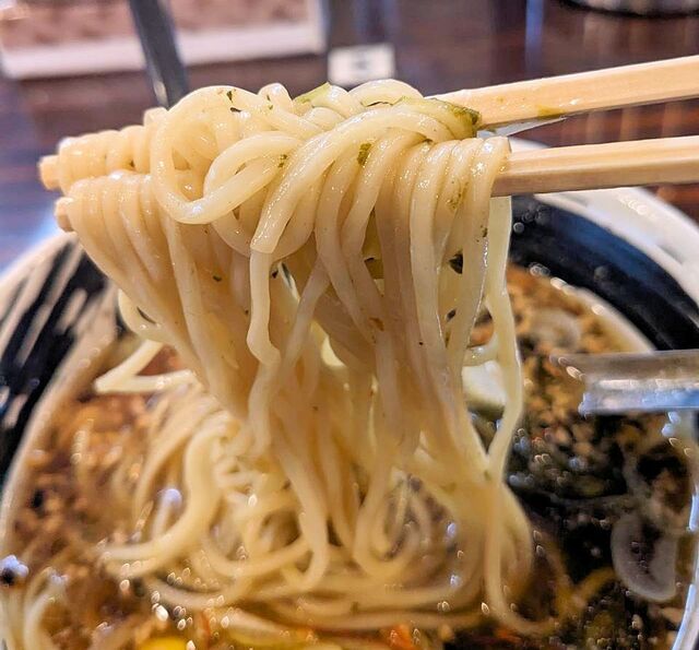麺は、最近の加水率を抑えたザクッとした食感の麺と、古典的な茹で上がりに透明感のあるツルツルの中華麺の間くらい。18番中太麺でほぼストレート。色が白いのが印象的だ。あと、大盛りでなくとも麺量が多い。ちなみに大盛りのチケットも同じ値段である。