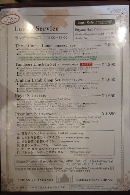 ランチメニューは、カレー3種にサラダ,ドリンク,お替り自由のナン,ライスが付いて \950とリーズナブルで、サイドディッシュ付 \1,235~\1,750の上位メニューも有ります。