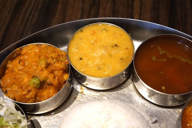 ノンベジは、チキンとキーマ,ベジはダルと野菜で、ラッサムも合わせると5種類のカレーが食べられるのは嬉しいです。