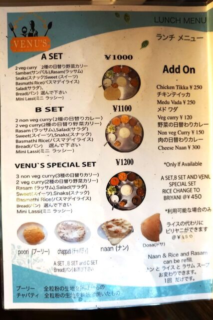 と、8年前からは \200ずつ上がっていましたが、ブレッドは、ナン,チャパティ,プーリ,ドーサから選択出来、ブレッド,ライス,ラッサムのお替りが各1回可能と、コスパの良さは健在でした。