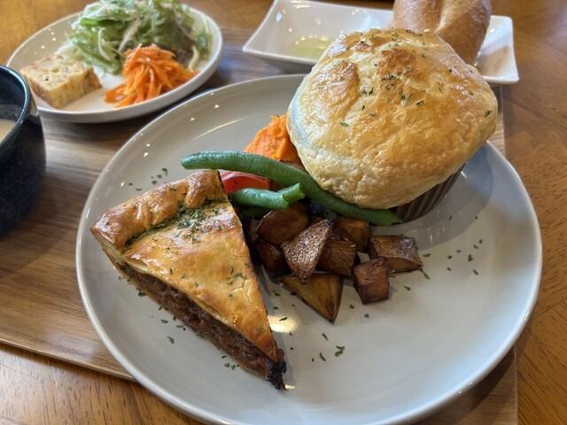10種類のパイ、キッシュ、タルトの中からミートパイ、チキンのポットパイとドリンクはラテ+¥80