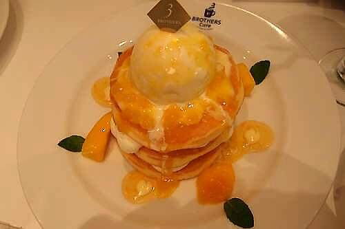 パンケーキ3段の間にマンゴーとヨーグルトクリームで超豪華。