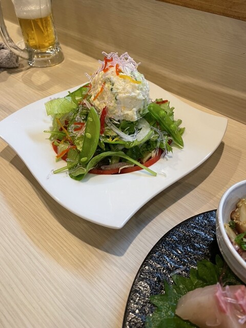 まずはサラダ。二人で食べるのにちょうど良い量でした。スナップエンドウも入っていて美味しかったです。刺身の盛り合わせもお値段以上に豪勢で堪能しました。お勧めに鶏モモの素揚げと衣揚げがあり友達が素揚げを食べていました。どの料理も美味しく頂きました。