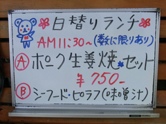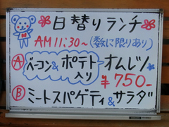 ランチは日替りで入り口脇のベンチに置かれたホワイトボードで