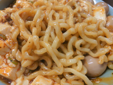 麻婆豆腐と太麺のマリアージュが理想的なのです。
