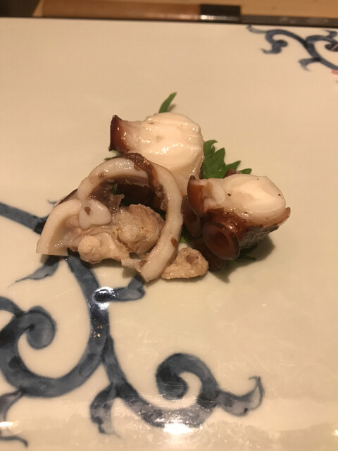 お料理も、茹でたてのタコを目の前でぶつ切りにしてくれたり、焼きアナゴ、新物のカキ、イカそうめんなどのスタンダードなものから、酢飯とアワビの肝や蒸し鮑を使った一口鮑丼、寿司屋でオイルサーディン、あん肝と奈良漬を和えたもの、イカの肝のルイベなどのかわったものまで色々と。