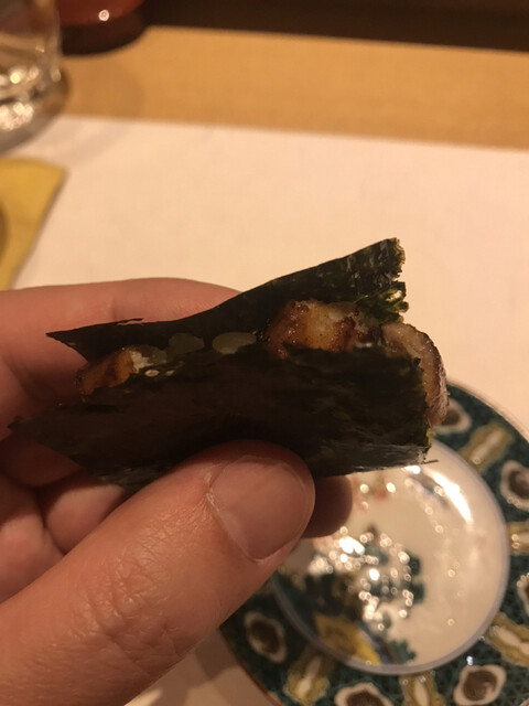 牡蠣はびっくりするほど大ぶり。下にシャリが入っていて、一口でどうぞ、と言われますが女性だと困るくらいのサイズ。絶妙な火入れで牡蠣の旨味が最大限にひきだされてます。