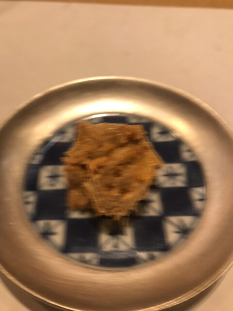 その後、ホタルイカの温かいお寿司。ミニミニ丼ですね。ホタルイカのエキスがでた温かい餡が素晴らしい。延々と舐めて日本酒を飲めそう。