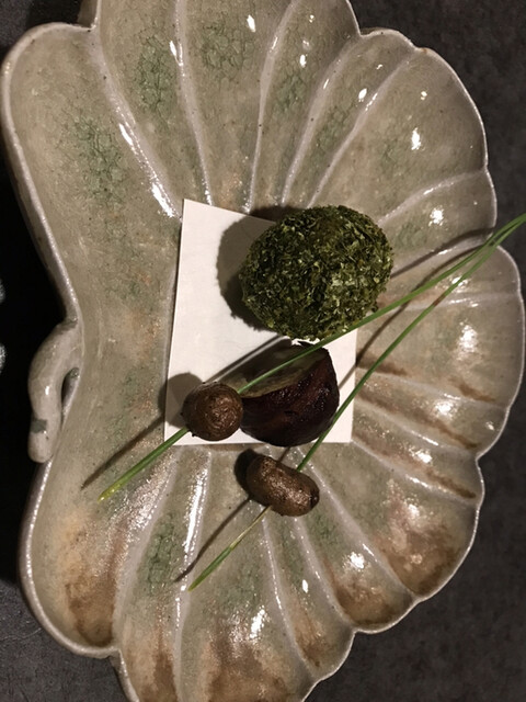 栗の渋皮煮を揚げたもの、シンプルなムカゴも良いですが、ウニを栗の餡で包んで小さなコロッケにした一品が面白い。栗の甘さからウニの風味や塩味がでてくると良いアクセントに。