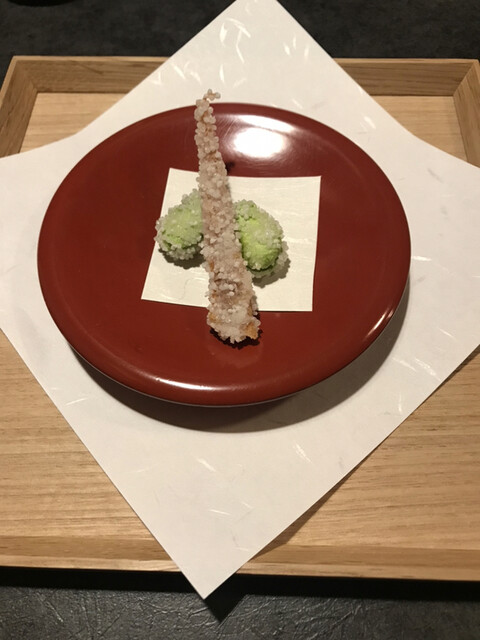 次は串揚げ2品。タケノコとホタルイカの串揚げ。ソースは木の芽味噌です。タケノコはつぶして団子になってます。完全に潰れていないので食感もあり美味しいです。