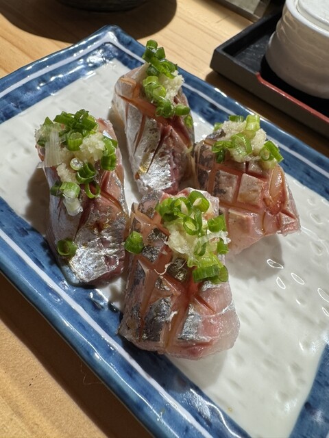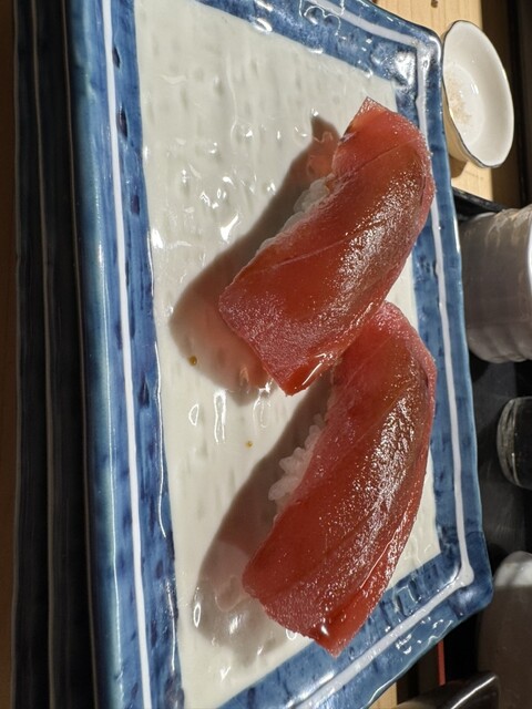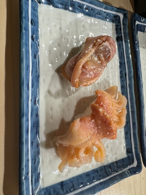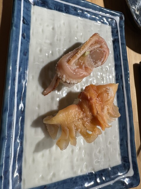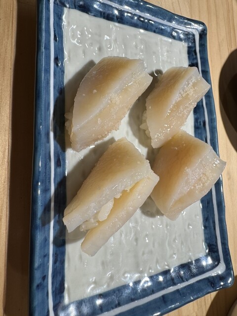 赤貝、タイラギ、小アジ、マグロと握りをいただきます。全部美味しいですね。タイラギは少しかわった握り方。タイラギって、握りにすると貝の固さというか食感がシャリとあいにくく感じてましたが、これはいい感じ。小アジは旨すぎたので握りでも。後から頼んだ人は売り切れですと言われてました(笑)ごめんなさい、旨すぎたので(笑)