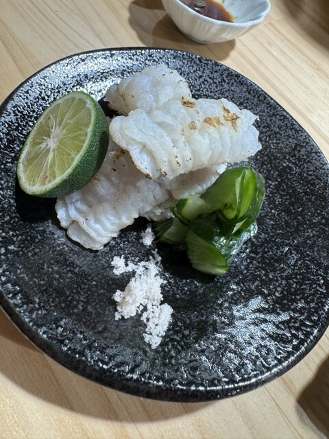 鱧の焼き霜は塩か梅肉。梅肉にはワサビを混ぜ込んで下さいと。なかなか珍しいですね。個人的には塩が好み。美味しい鱧です。