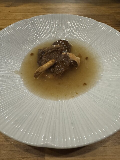 ハタで白ワイングビグビ、蟹のサラダ巻きでもグビグビ、白子と山ナメコでもグビグビ、、、てか、このスープ本当に美味しい!って思ったら、前に凄く気にいった生ハムのスープがベースだとか。ナメコが入っているからまた違った印象でしたが、なんせ美味しいですね。