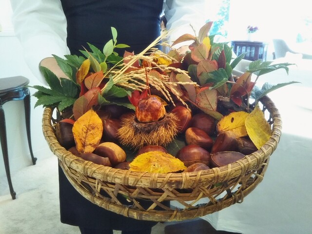 始めは栗満載の籠から自分で小袋を拾う演出です。秋の要素を詰め込んだアミューズの美味しさに吃驚。