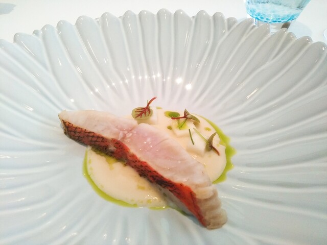 蒸し煮にした金目鯛に、蕪のピュレと山葵のオイルを添えて。