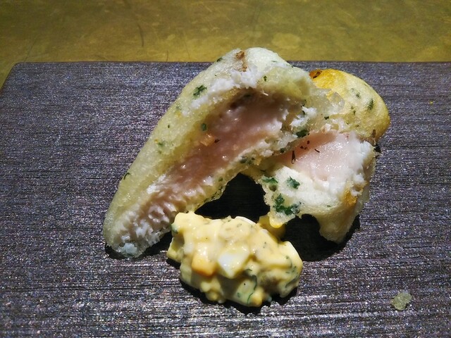 クレープのような生地に白子や野菜が包まれ、下にエビのマヨネーズが添えられた一品。だったと思いますが、失念。間違っていたらごめんなさい。食感が楽しかったです。