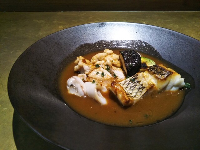 ヤリイカや揚げた鮮魚に、複雑な旨味を凝縮したブイヤベース。揚げの香ばしさと、トマトと魚介の出汁の滋味深さを堪能できる一品です。
