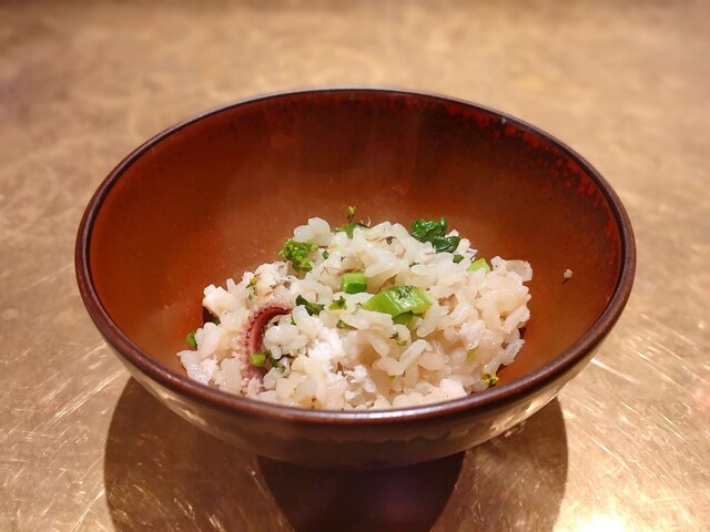 鰆と、茸など食感のある野菜とを、鶏の出汁で炊いたご飯。鰆で間違い無いと思いますが、これほど力のある旨味が発揮される魚だったとは驚きました。途中、鶏の出汁をかけてお茶漬けのようにしてさらさらと頂きます。食べきれない場合は持ち帰りにもできます。