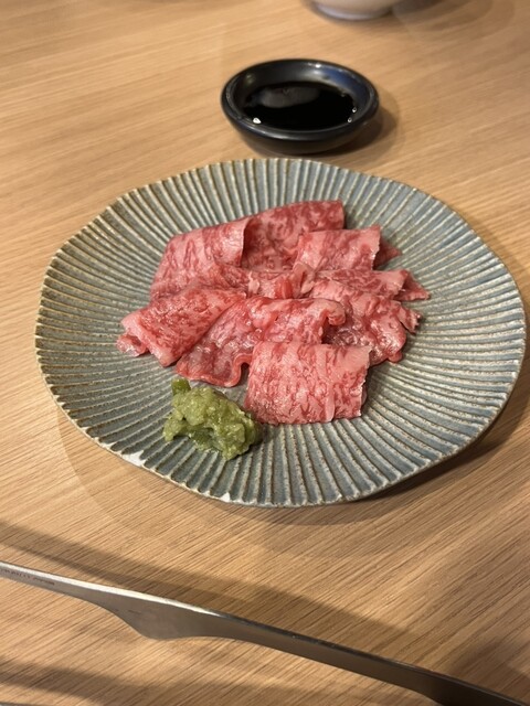 レアステーキ。たたきに近い。赤身が多いのに全然固く無い。おろしにんにくを少し多めにつけていただくと絶品。店主オススメベスト1。