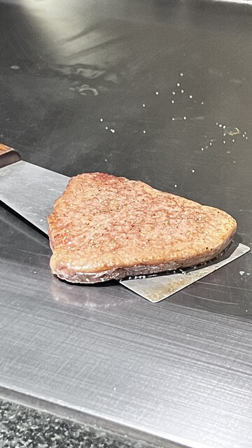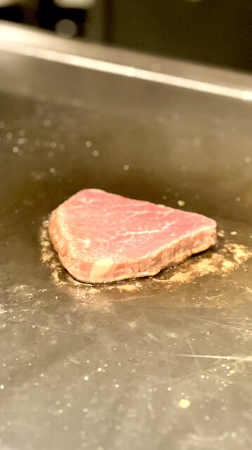 表面をステーキする前に側面を焼いていくリソレという手法で旨みを閉じ込める様です。一般的には鉄板焼ではそうしないお店が多いので、こちらも鉄板焼というよりはフランス料理といった感じですねー。
