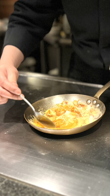 海老の香りは油に移るので鉄板ではなく、フライパンで調理するらしいです。そしてブランデーの良い香りを移すためにフランベ!映えますねー笑。そしてこのソースが美味い。