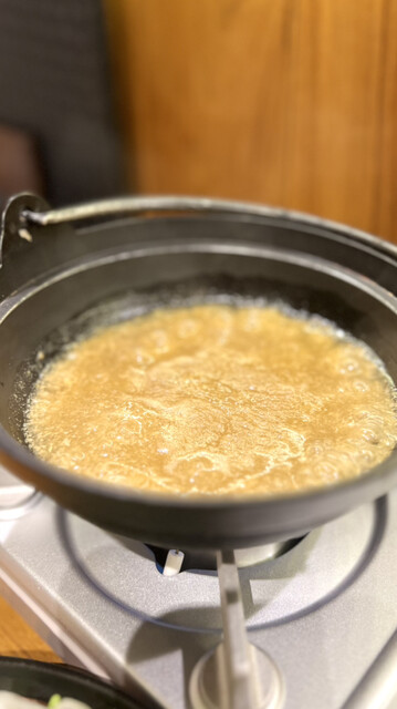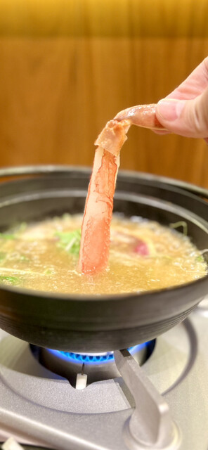 いきなり、こちらのお店の代名詞とも言える蟹しゃぶ。とろみのあるカニ味噌の出汁に潜らせ頂きます。鮮度が抜群のズワイガニと出汁と濃厚なカニ味噌が絡んで美味くないわけがありません。水菜とネギがたっぷりで、濃くなってきたら出汁で調節することも出来ます。美味いです。雑炊も食べたいけど、土鍋ご飯も食べたかったので今回は我慢。笑