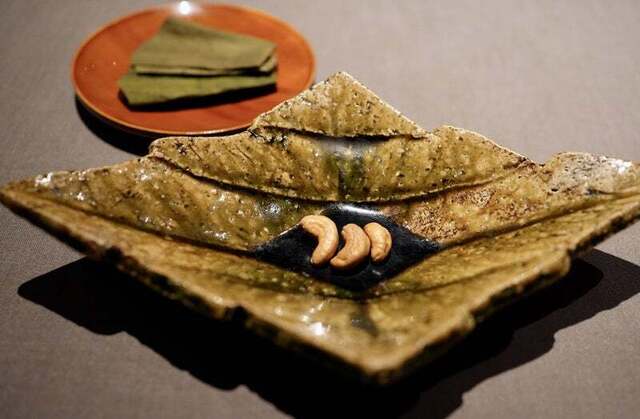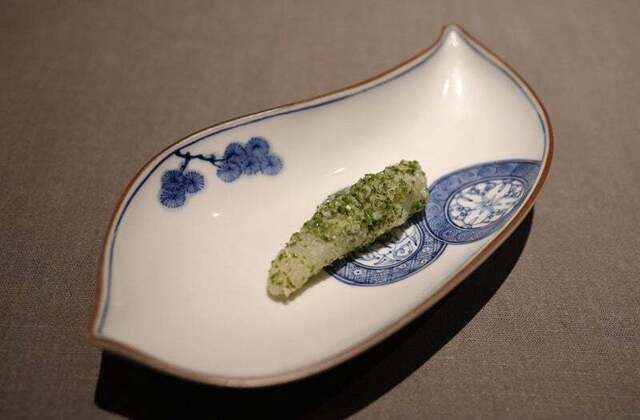 緑茶の葉が一枚おかれ、また緑茶のオイルが見た目も味わいも清々しい。