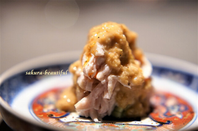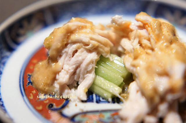 鶏のかたまりにバンバンジーの胡麻香るソースがかかっています。