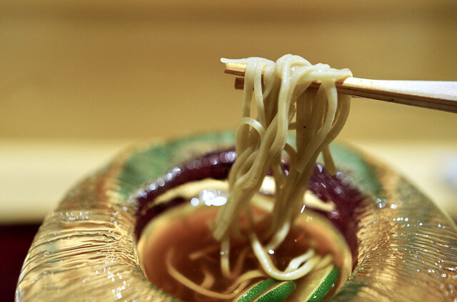 こんな篠原氏のプレゼンテーションの中に、氷の器に入ったすだちそばや